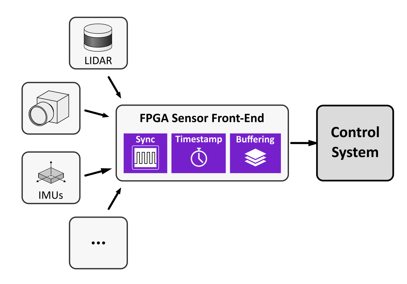 Perception stacks depend on sensor timing and alignment: camera/LiDAR/IMU data often arrives with inconsistent latency, weak synchronization, or fragile interface glue. FPGA-based sensor front-ends implement timing-accurate interfaces, deterministic timestamps and multi-sensor synchronization close to the source. This stabilizes downstream estimation and perception, and reduces integration risk when sensor links or timing constraints are non-trivial. Where needed, the sensor front-end (interfaces, clocking, analog/digital boundaries) is developed as a coherent subsystem rather than ad-hoc glue.